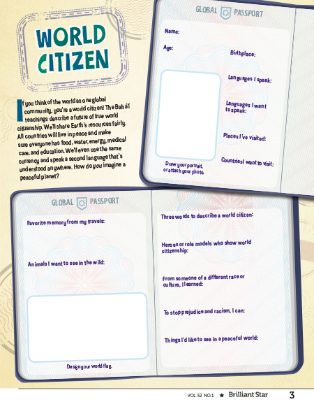This page encourages readers to imagine themselves as world citizens—part of a global society that lives in peace, where everyone is treated fairly. They’re invited to write about their ideas for a peaceful world with no racism or prejudice.