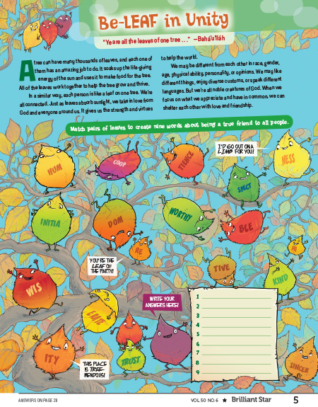 > Cut out paper leaves, and write a word fragment on each. Give a leaf to each student, and ask them to find the student who holds the remaining portion of their word. When the two students find each other, they work together to create a skit about their word and what it means. After the skits are performed for the larger group, everyone completes the page in the magazine.