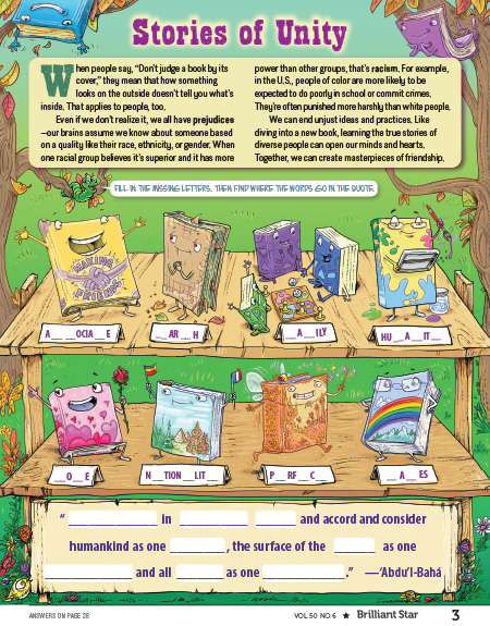 This piece uses the adage “Don’t judge a book by its cover” to introduce prejudice and racism. The terms “prejudice” and “racism” are defined and examples are offered. Personified books have covers that illustrate specific words, and students fill in the missing letters in the words. Students then figure out where the words belong in a Bahá’í quote.