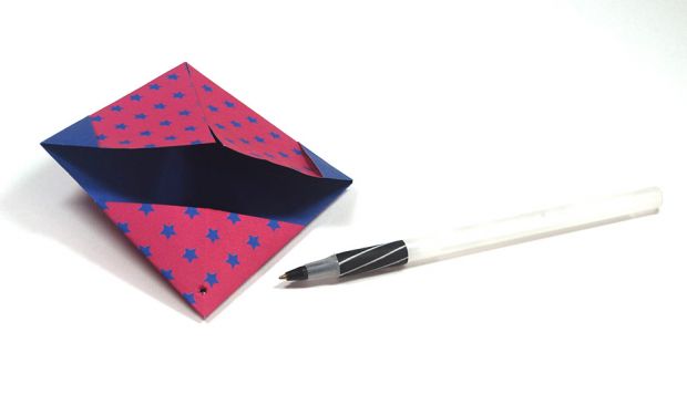 Step 4: Fold top corners to meet at center. With pen tip, punch hole in bottom corner of outer pocket. Don’t pierce back layers.