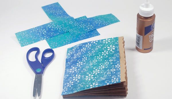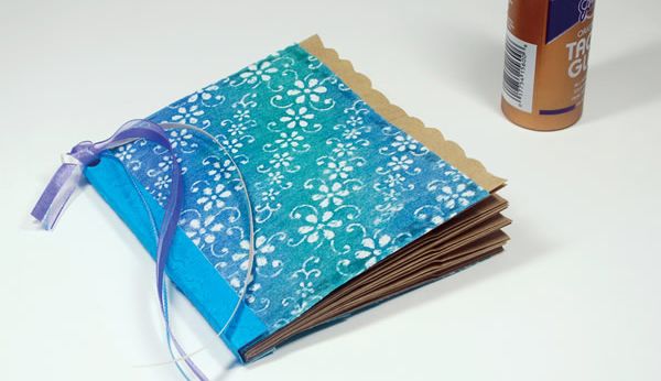 Step 10: Punch a hole in center of front and back cover’s open end. Knot a ribbon to each hole and tie ribbons together, for closure.
