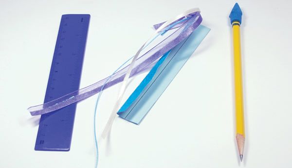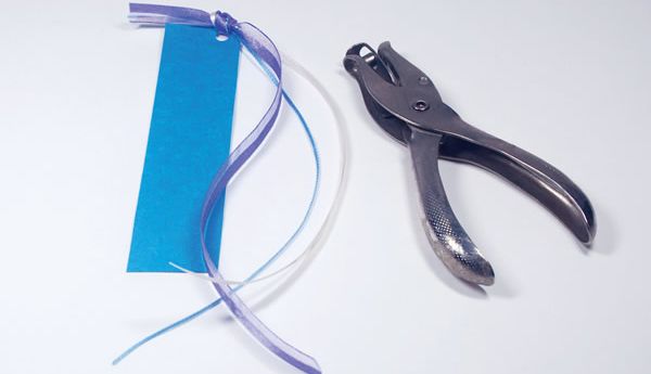 Step 6: Create a bookmark by punching a hole into top right corner of thick paper. Knot three ribbons to hole. You’ll insert ribbons into pages as needed.