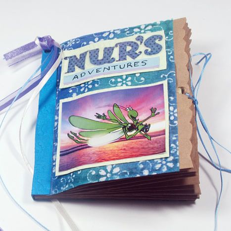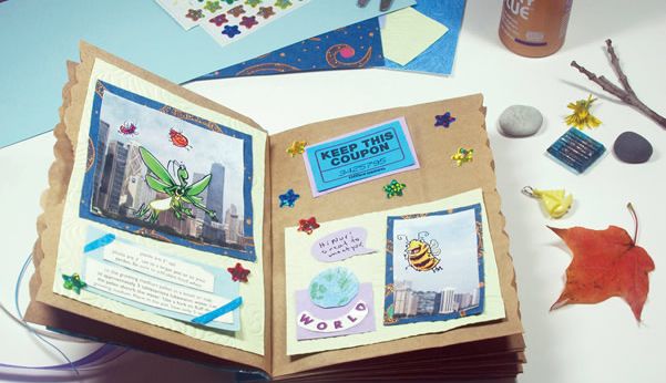 Step 9: Decorate book with colorful paper, stickers, stamps, or markers. Add photos, postcards, drawings, or text, and put small souvenirs inside pockets.